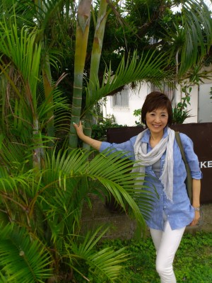 渡名喜島の「私」の赤瓦の古民家前にて。