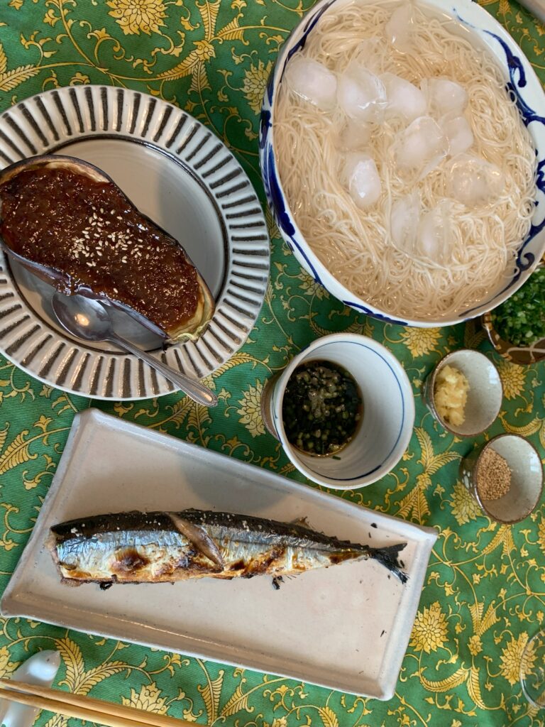 米茄子田楽も夏素麺も美味し。会話が弾む食卓なのでした。