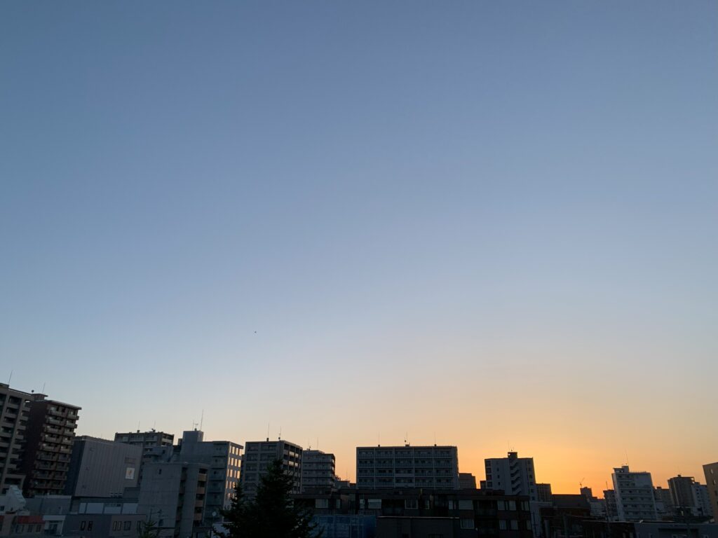 朝日が東の空をオレンジ色に染め、ビル群のシルエットもくっきり見えます。
