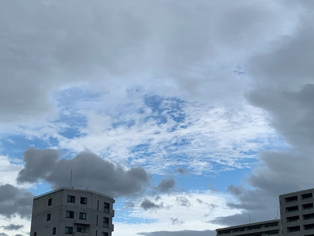 白露の朝、西の空は雲の間から少し青空が見え始めていました。
