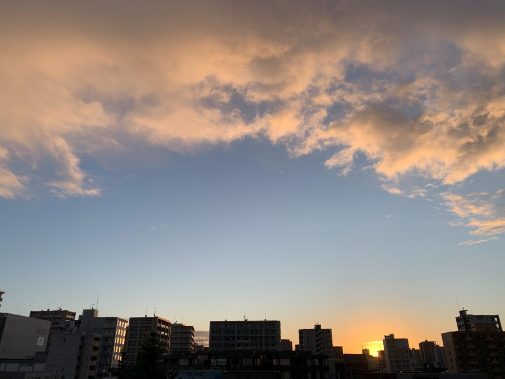 生まれたばかりの朝日がオレンジ色に輝きながら東のビル群の間から昇ってくる。