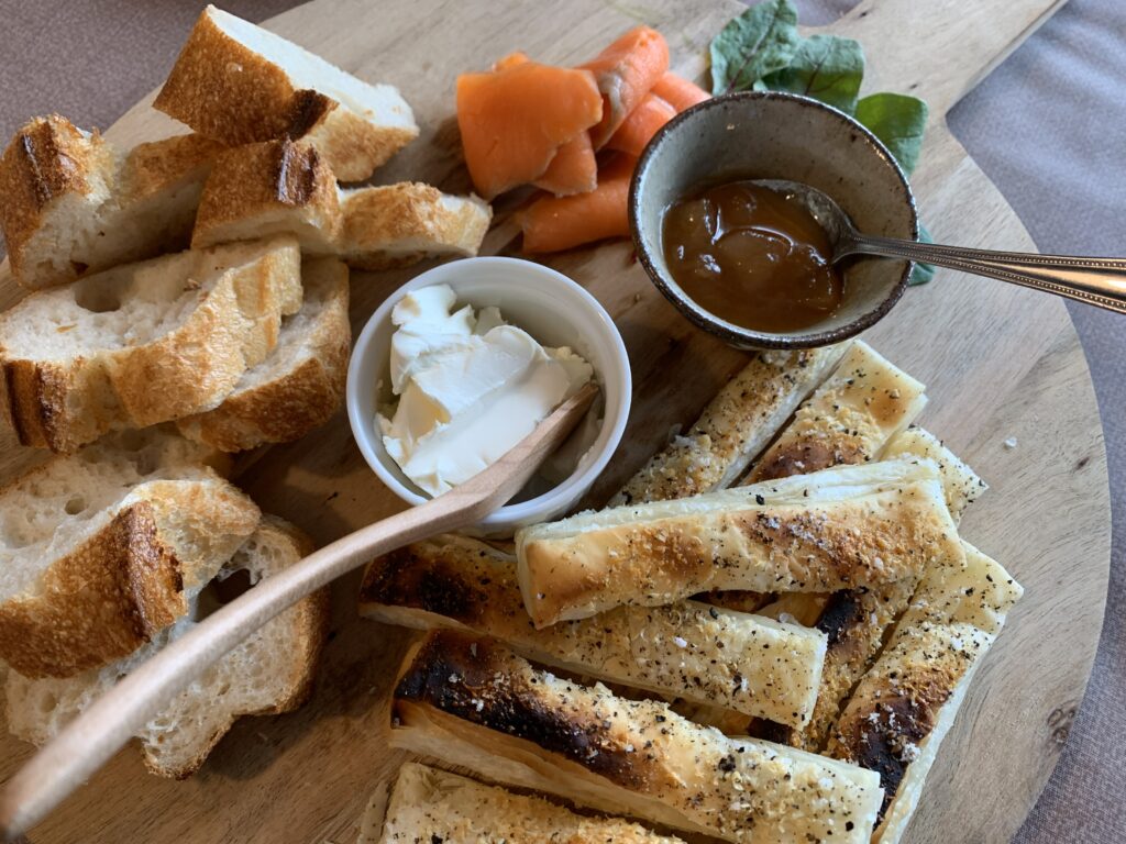 スモークサーモンとクリームチーズ、余市のジャムとバゲットも載せました。
