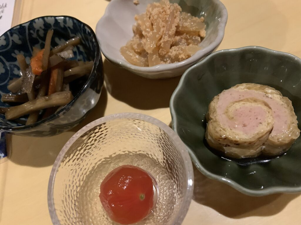 まずはお通し4品がお出迎え。鶏肉の信田巻、きんぴらごぼう、子和え、ミニトマトの酢漬け、これ4品で一人前。