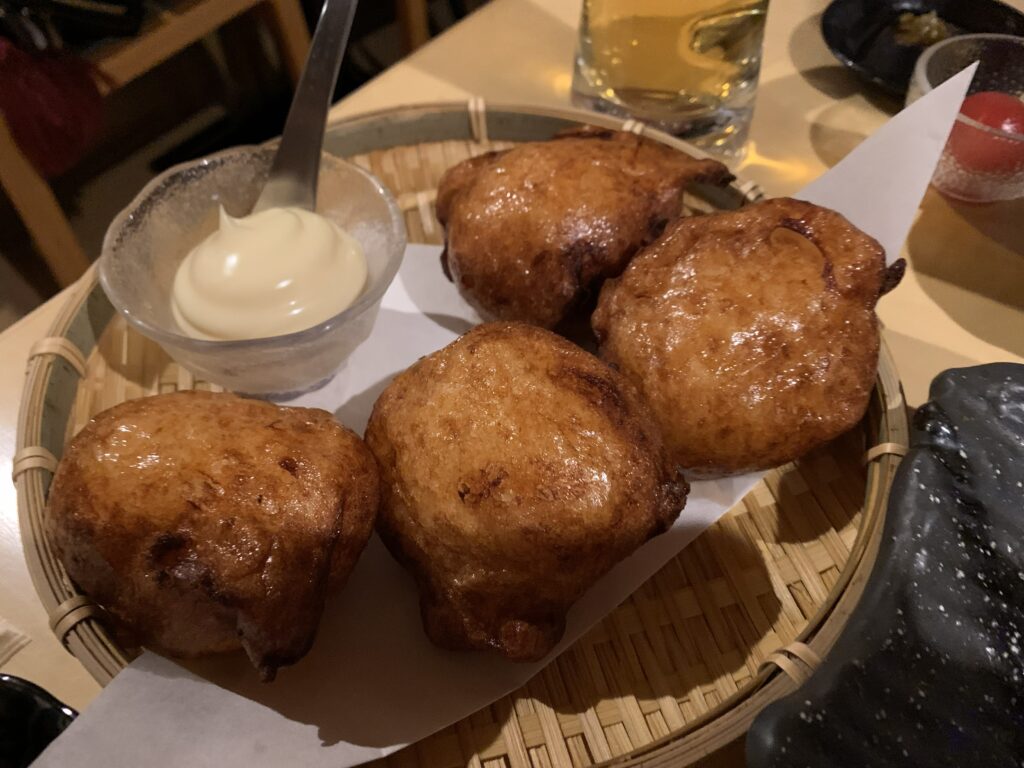 いざ、熱々のソフトボールのようなさつま揚げに自家製マヨをちょいつけて、