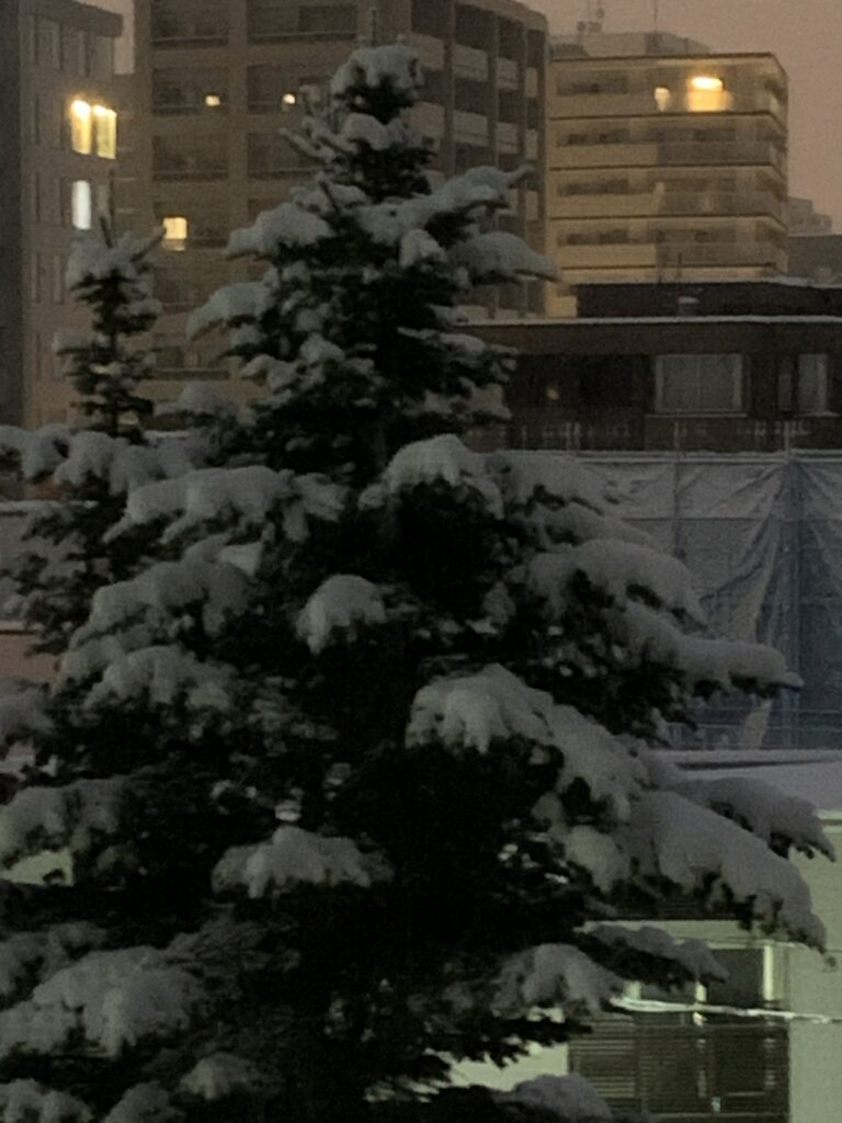 夜明け前、雪をのせた緑の木、オーナメントやイルミネーションを飾りたくなる。