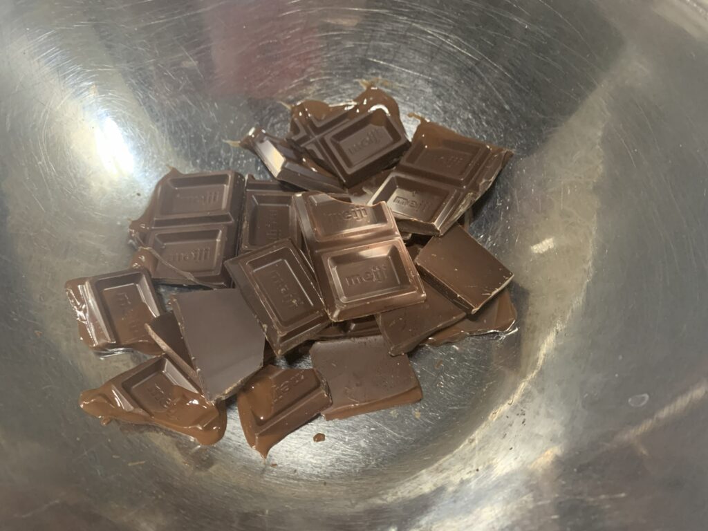 まずは冷蔵庫にあったブラックの板チョコを湯煎にかけて溶かし、
