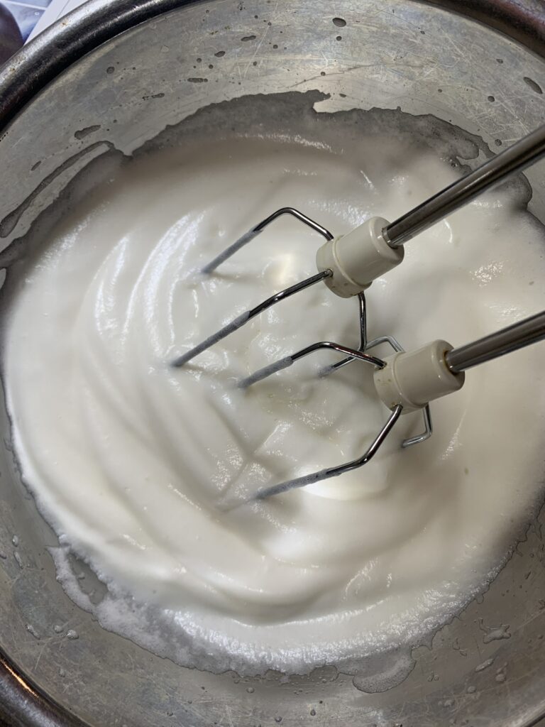 卵を黄身と白身に分け、卵白に砂糖を加えて角が立つくらいに泡立てます。
