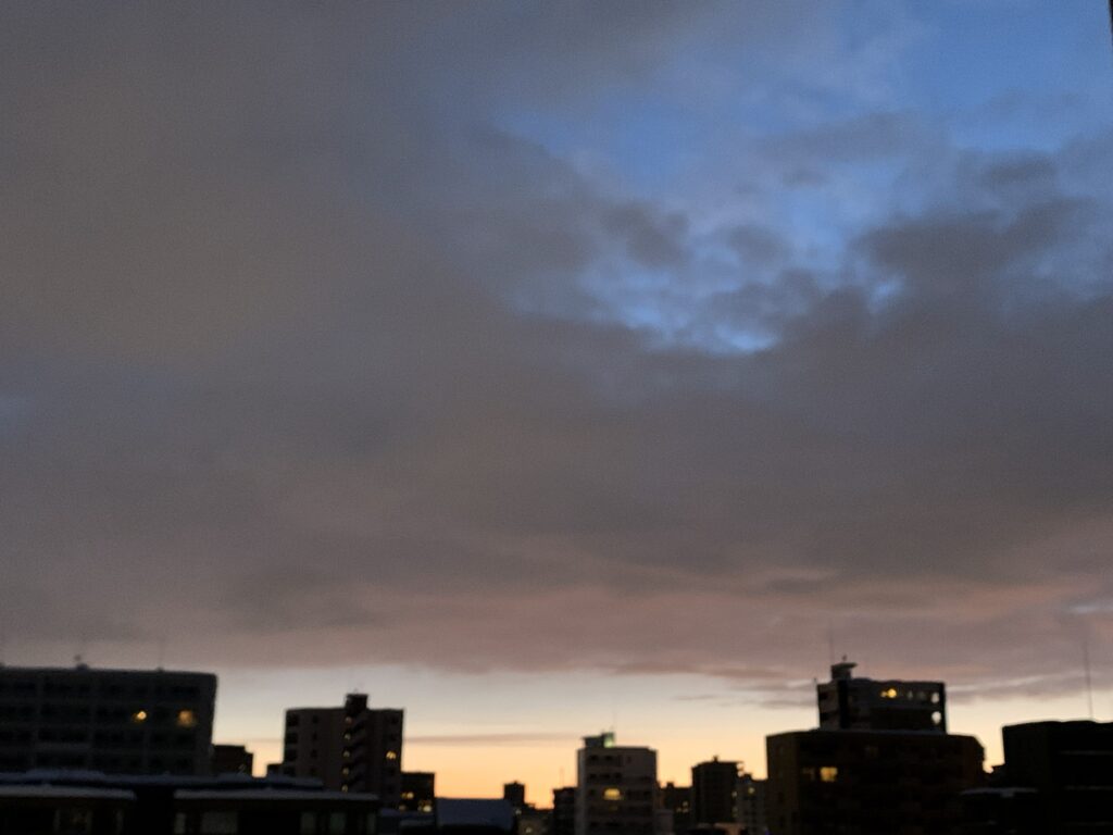 分厚い冬の雲の下はビル群が明るいオレンジ色の曙に染まり、
