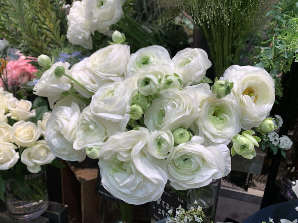 花屋さんの白いバラもお待ちかね。