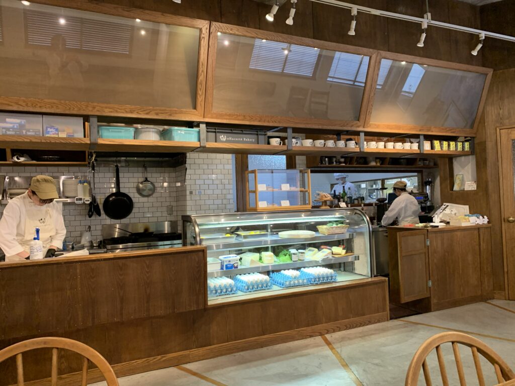 カウンターの向こうのガラス張りのキッチンではタルトやパンが焼き上げられています。