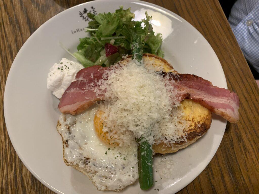 甘くないフレンチトーストに目玉焼き、ベーコン、アスパラガスのグリルが載って、